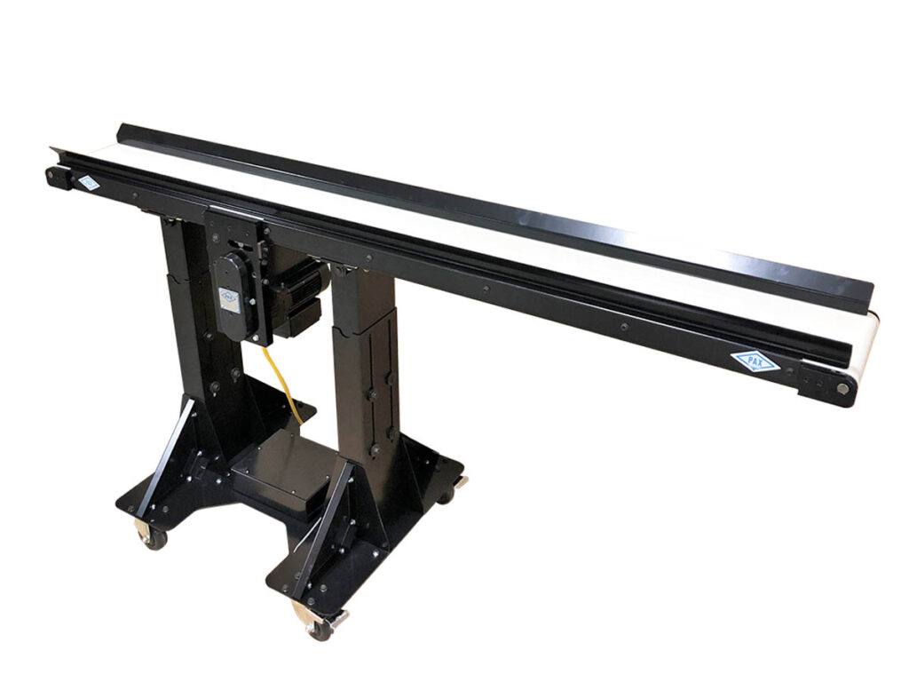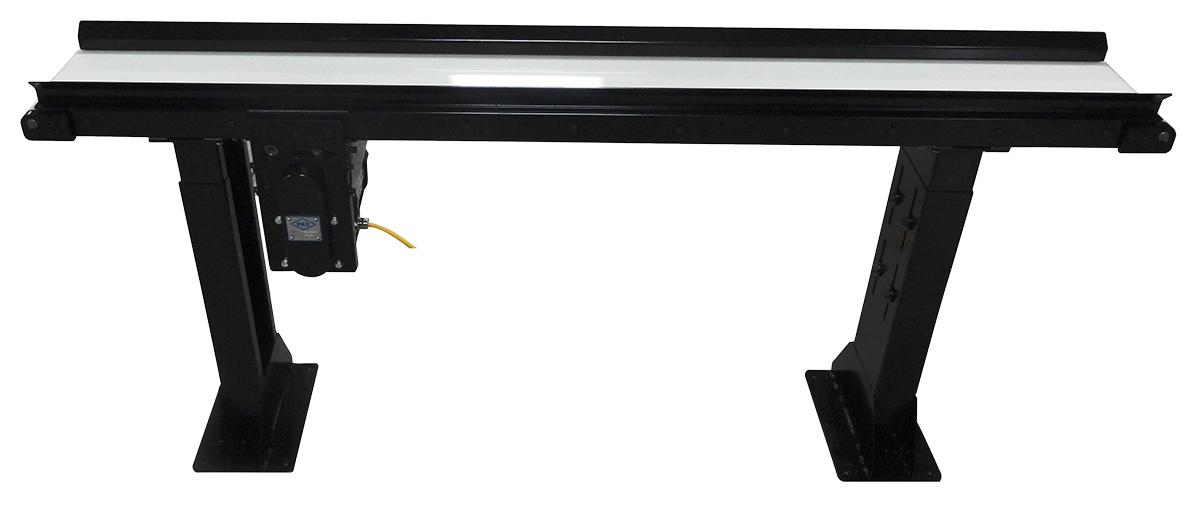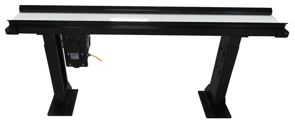 This rugged conveyor can be configured and customized as required to meet a wide variety of applications. The motor, drive pulley, and belt tensioning for this conveyor are located beneath the conveyor, which keeps the top of the conveyor unobstructed. The motor’s exact location can be specified by the customer at the time of order.