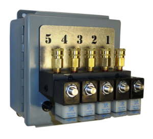 The Pax Model V5M may be utilized for central lube system applications. This assembly includes 5 solenoid valves that can be independently controlled and may be programmed to spray at different intervals and for different durations during a press cycle. Either Pax’s control or a customer-supplied control can be utilized to control the individual solenoids on this unit.