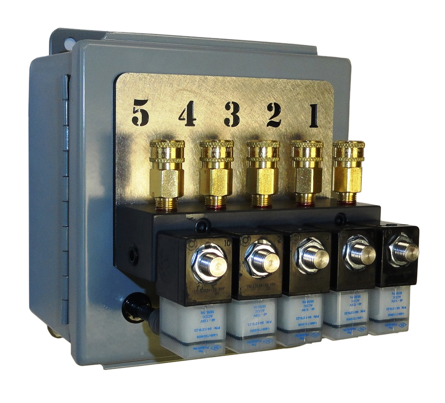 The Pax Model V5M may be utilized for central lube system applications. This assembly includes 5 solenoid valves that can be independently controlled and may be programmed to spray at different intervals and for different durations during a press cycle. Either Pax’s control or a customer-supplied control can be utilized to control the individual solenoids on this unit.