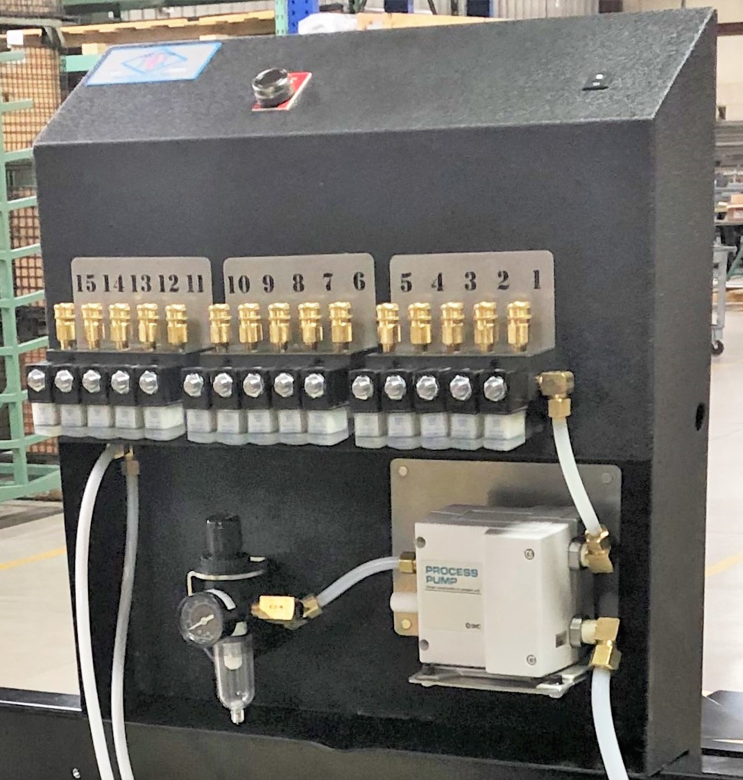 A large diaphragm pump supplies filtered fluid to the individual spray lines at pressures up to 100 psi.